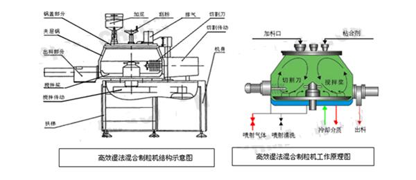 物料通过人工加料或真空投料等其他方式进入料缸,在搅拌浆的作用下被机械力流化,在料仓内形成良好的运动轨迹,实现均匀混合。注入粘合剂后,使物料粉末间桥架成细小颗粒,在搅拌桨机械力作用下,逐渐长大形成符合要求的颗粒。
