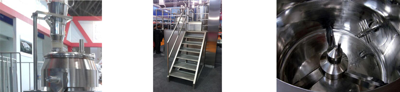缸盖上安装真空上料机:通过负压将粉体物料吸到上料机料斗内,在有时间控制上料机放料阀将物料放到湿发锅体内。加料结束后可打开上料机与湿发制粒机间的快装将上料机旋开。